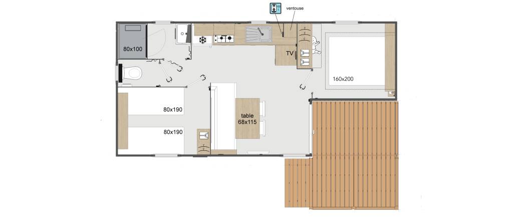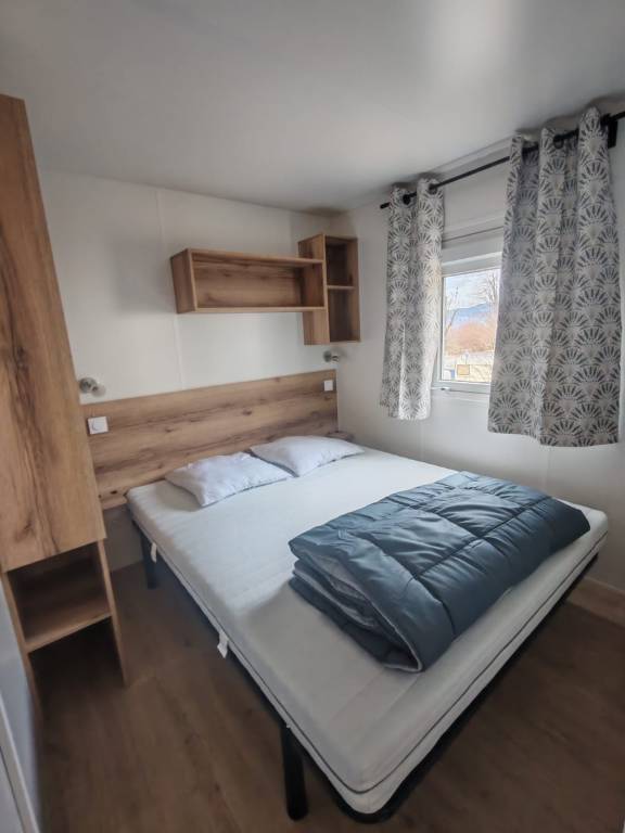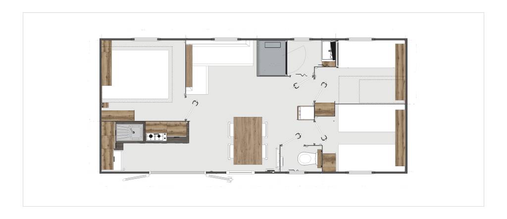 Mobil homes neufs équipés d'une cuisine entièrement équipée, de trois chambres (une avec lit king size, une avec 2 lits simples et une avec lits gigognes), d'une salle de bains moderne et d'une terrasse privée. Réservez dès maintenant vos vacances au camping le Rys en Haute Savoie